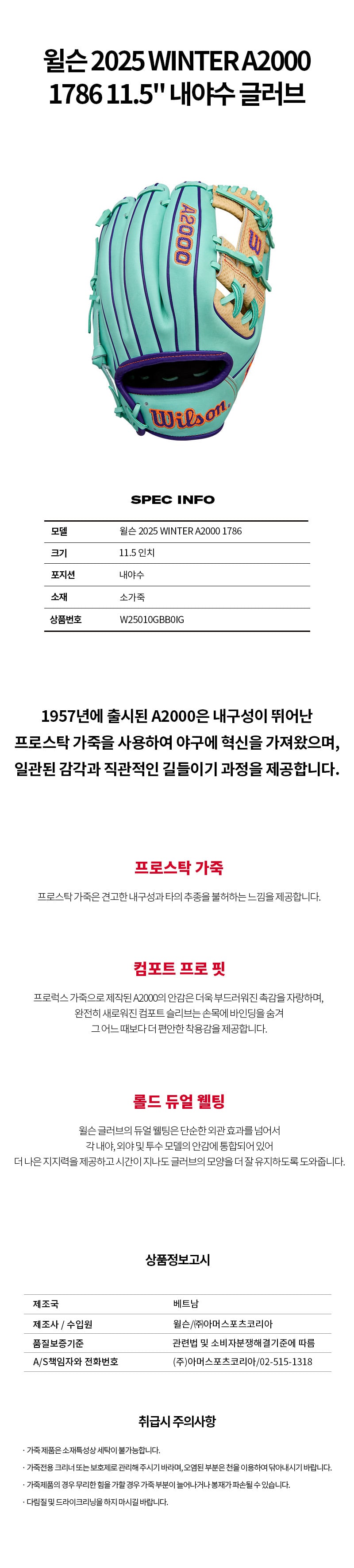 윌슨 2025 WINTER A2000 1786 11.5" 내야수 글러브