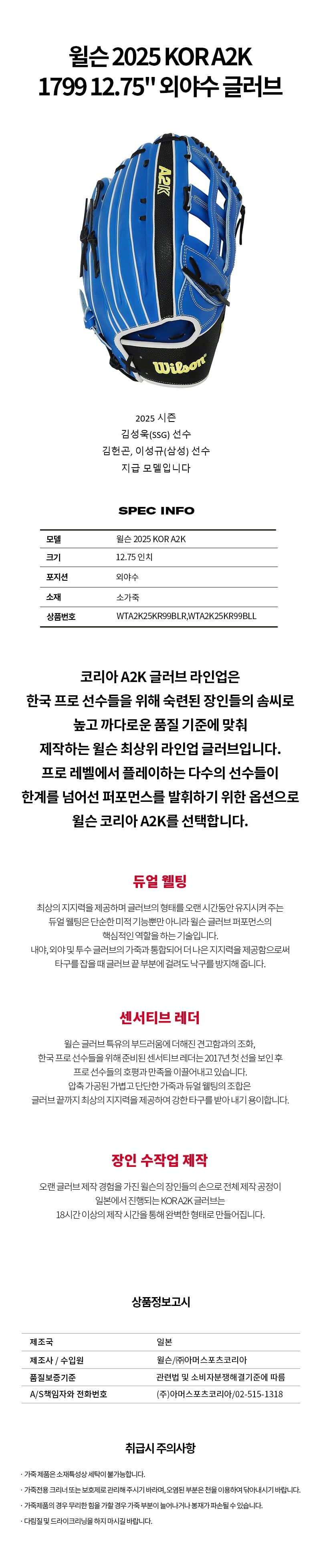 윌슨 2025 KOR A2K 1799 12.75" 외야수 글러브